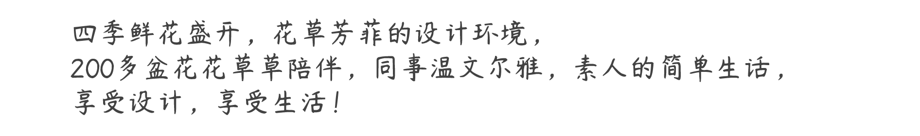 四季鮮花盛開,花草芳菲的設(shè)計(jì)環(huán)境,200多盆花花草草陪伴,同事溫文爾雅,素人的簡單生話,享受設(shè)計(jì),享受生活!