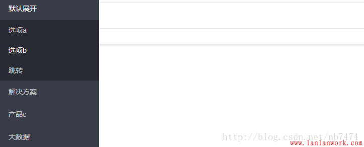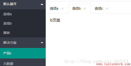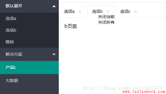 <div class="layui-tab layui-tab-card site-demo-button" style="position: relative;"> <ul class="layui-nav layui-nav-tree layui-nav-side"> <li class="layui-nav-item layui-nav-itemed"> <a href="javascript:;">默認(rèn)展開</a> <dl class="layui-nav-child"> <dd> <a data-url="a" data-id="11" data-title="選項(xiàng)a" href="#" class="site-demo-active" data-type="tabAdd">選項(xiàng)a</a> </dd> <dd> <a href="#" data-url="b" data-title="選項(xiàng)b" data-id="22" class="site-demo-active" data-type="tabAdd">選項(xiàng)b</a> </dd> <dd> <a href="">跳轉(zhuǎn)</a> </dd> </dl> </li> <li class="layui-nav-item"> <a href="javascript:;">解決方案</a> <dl class="layui-nav-child"> <dd> <a href="">移動(dòng)模塊</a> </dd> <dd> <a href="">后臺(tái)模版</a> </dd> <dd> <a href="">電商平臺(tái)</a> </dd> </dl> </li> <li class="layui-nav-item"> <a href="#" data-url="c" data-title="選項(xiàng)c" data-id="33" class="site-demo-active" data-type="tabAdd">產(chǎn)品c</a> </li> <li class="layui-nav-item"> <a href="">大數(shù)據(jù)</a> </li> </ul> <div class="layui-tab" lay-filter="demo" lay-allowclose="true" style="margin-left: 200px;"> <ul class="layui-tab-title"> </ul> <ul class="rightmenu" style="display: none;position: absolute;"> <li data-type="closethis">關(guān)閉當(dāng)前</li> <li data-type="closeall">關(guān)閉所有</li> </ul> <div class="layui-tab-content"> </div> </div> </div>js代碼: