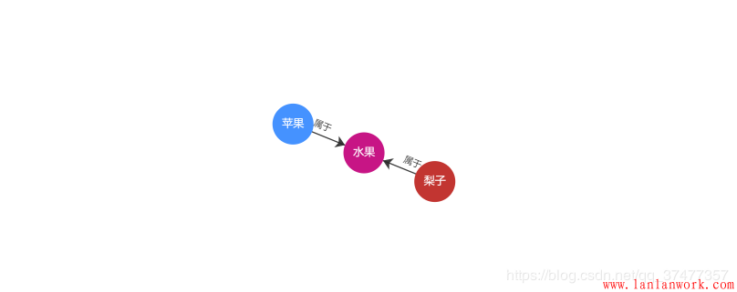 data = [ {name:'蘋果',category:1,id:0}, {name:'梨子',catagory:1,id:1}, {name:'水果',category:2,id:2} ] links = [ {source:0,target:2,category:0,value:'屬于',symbolSize:10}, {source:1,target:2,category:0,value:'屬于',symbolSize:10} ]