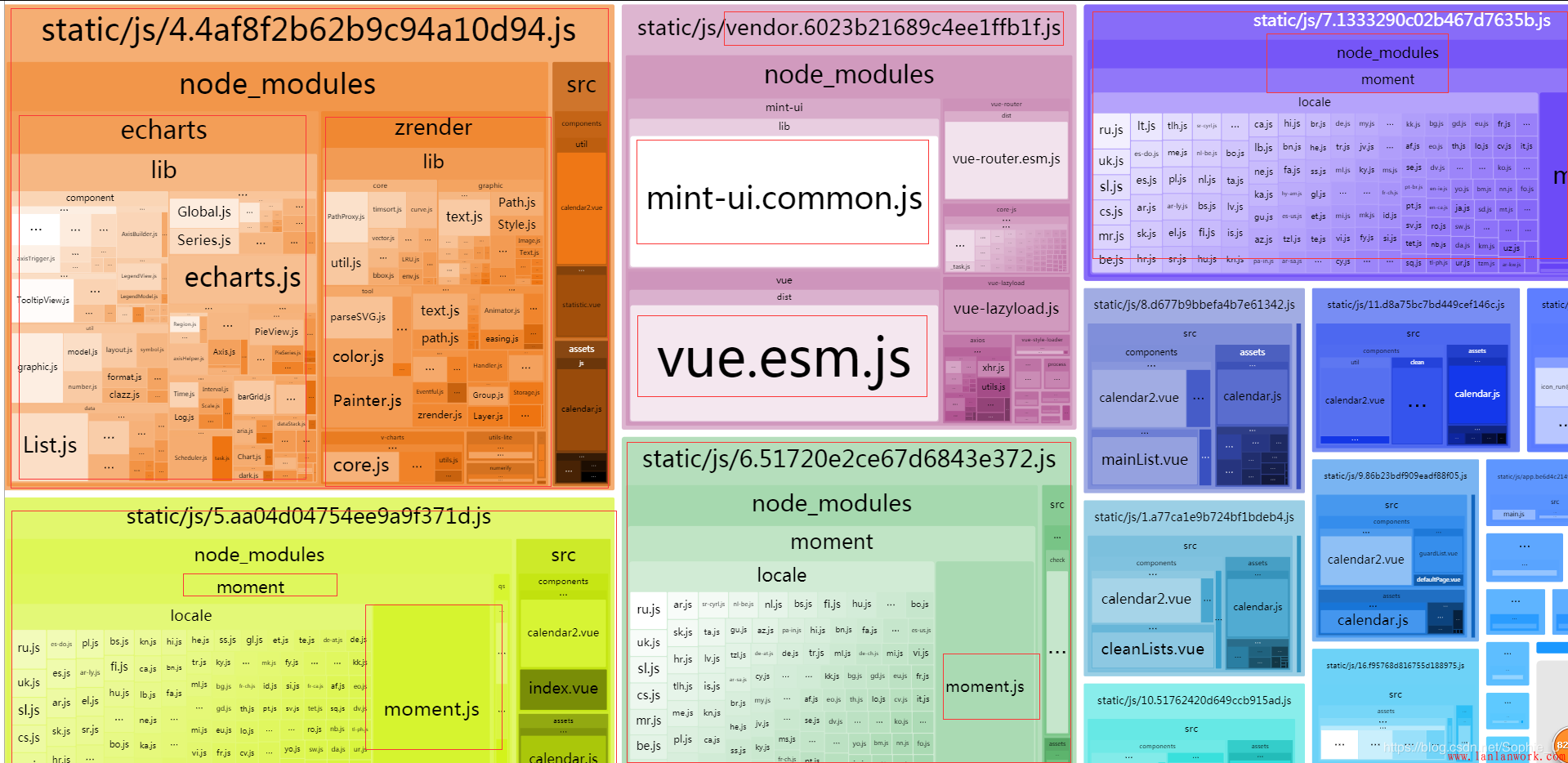 通過(guò)上圖分析可以知道打包后有幾個(gè)文件相對(duì)較大,vendor.js都知道是第三方庫(kù)文件打包形成,之前通過(guò)mint-ui按需加載會(huì)有一定的變化,后面記錄。這里著重看另兩個(gè)帶hash的js文件,這里并看不出來(lái)它為什么這么大,所以這里需要用到webpack打包分析工具來(lái)做進(jìn)一步的打包文件分析:webpack-bundle-analyzer