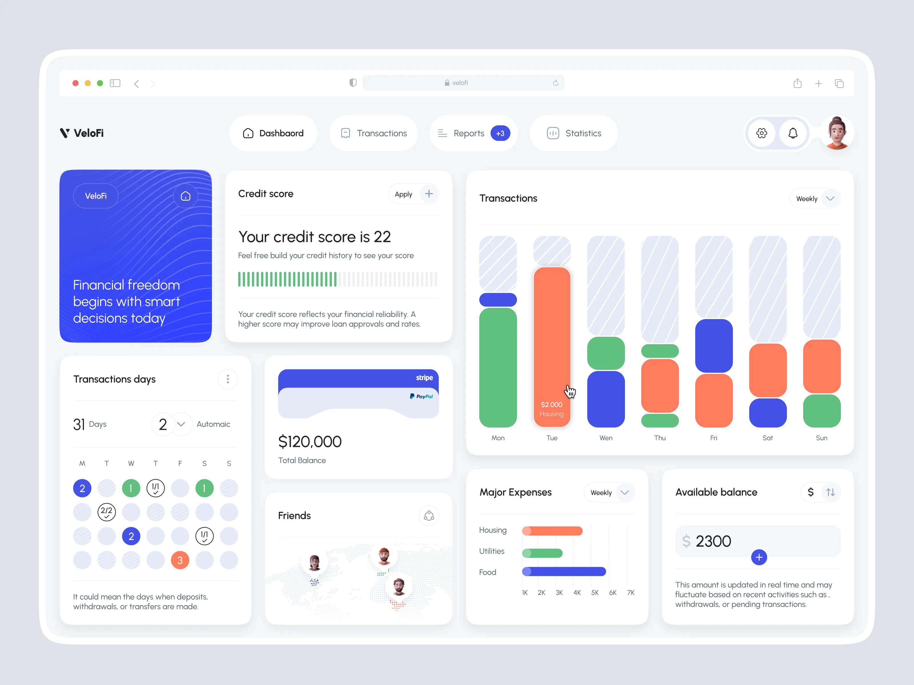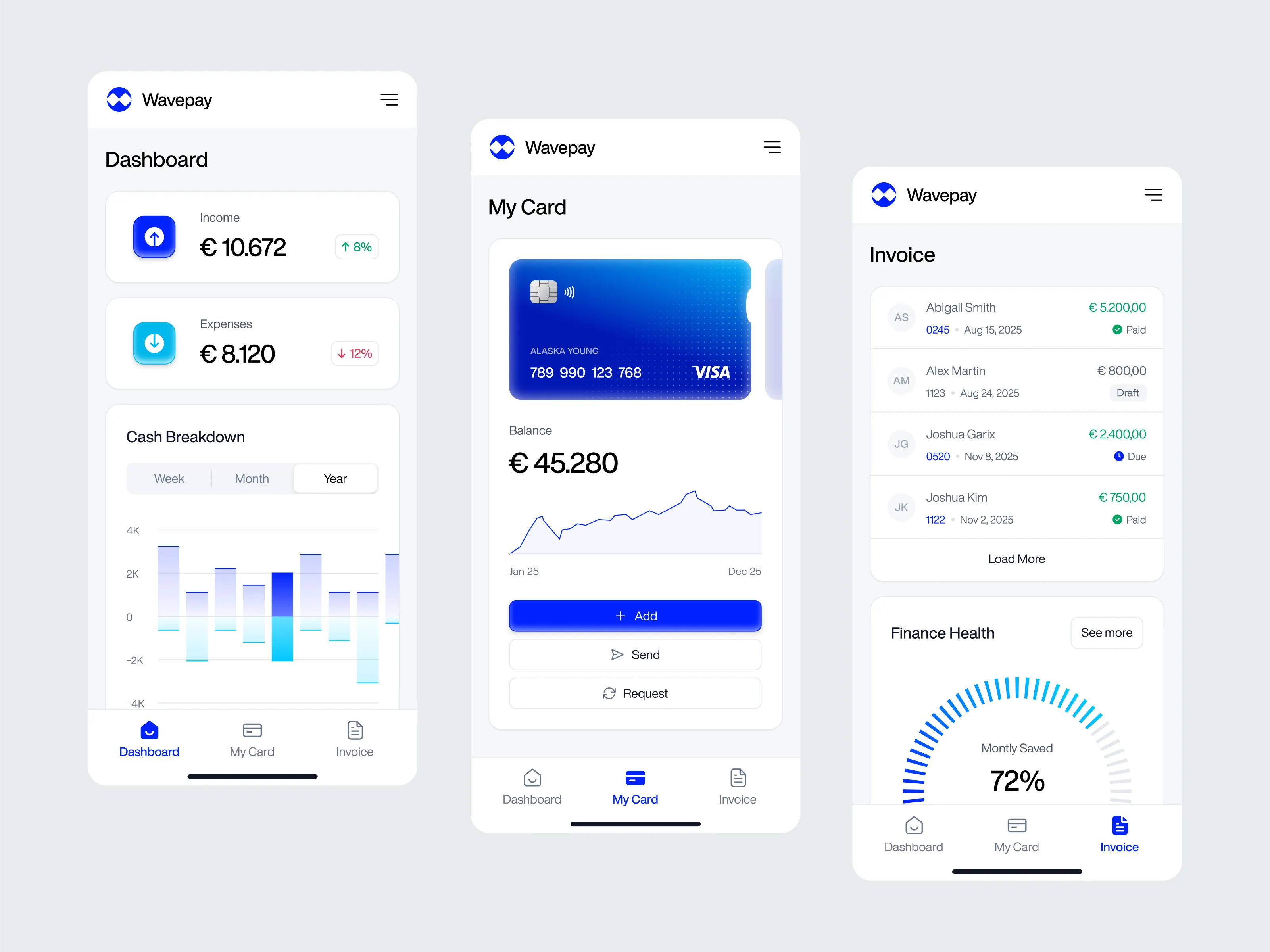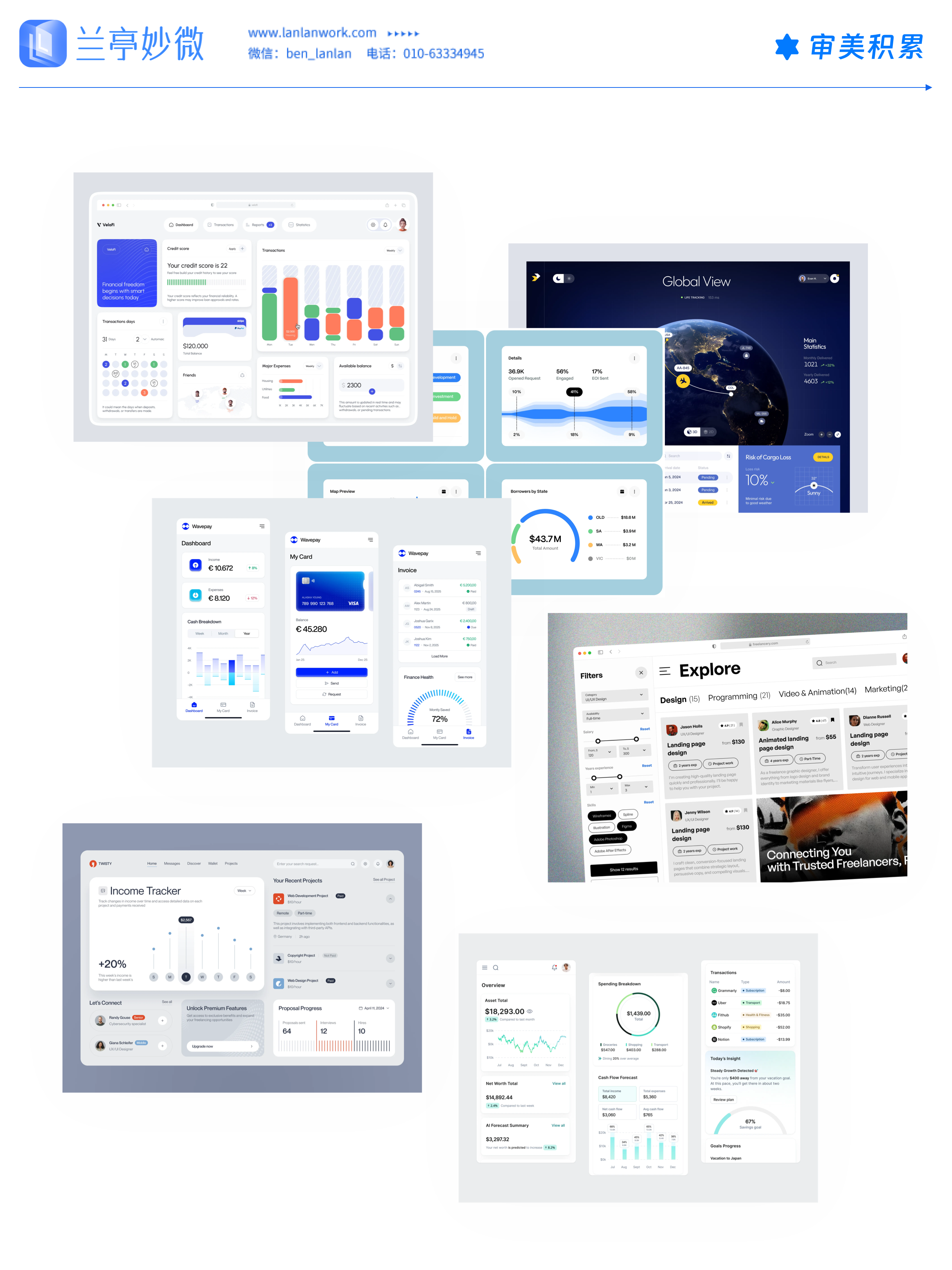 • 數(shù)據驅動:多個頁面核心是數(shù)據追蹤(收入、支出、信用分數(shù)、項目進度),界面清晰展示變化趨勢。