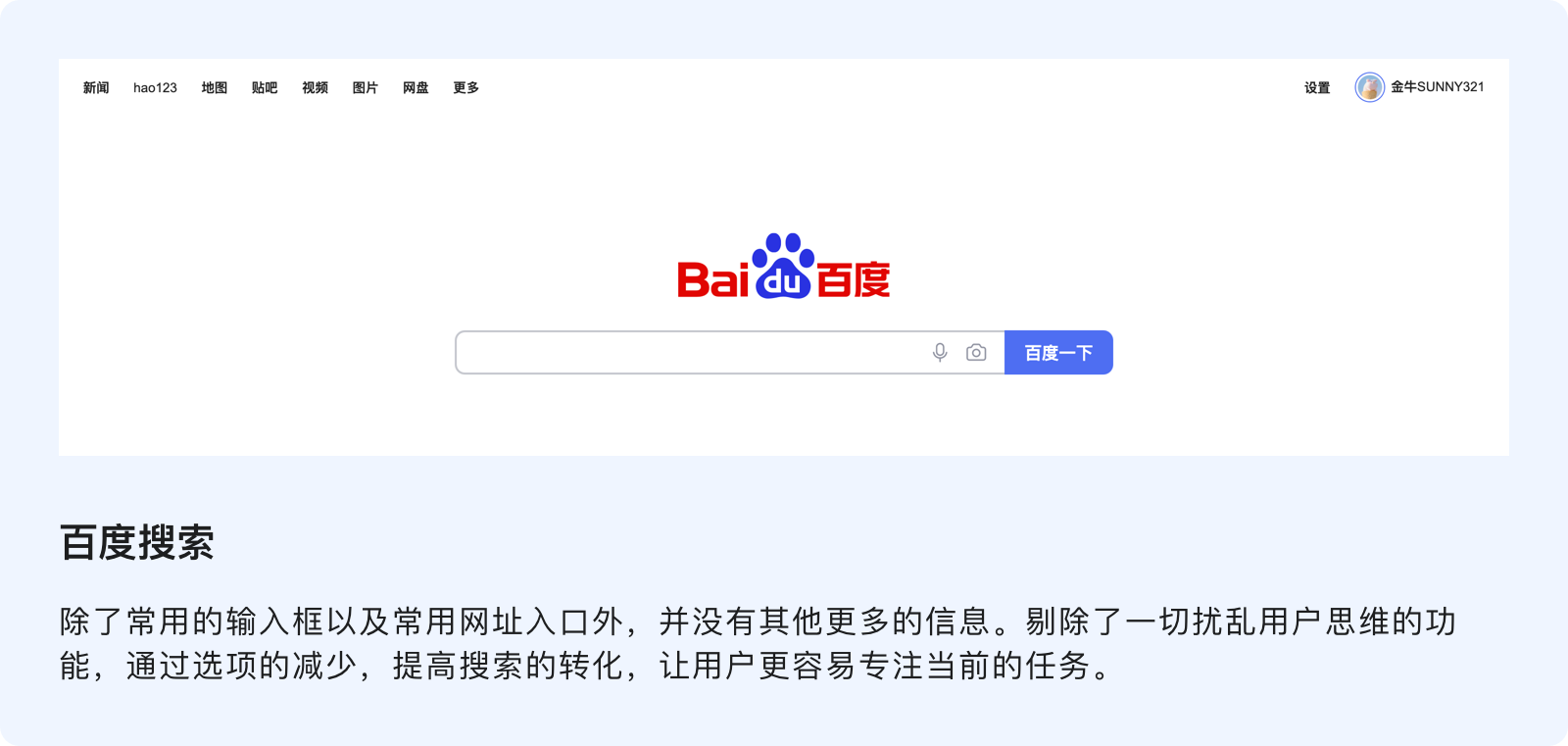 網(wǎng)頁通過大面積的留白營造平和感,通過高反差的對比創(chuàng)造視覺焦點(diǎn),將必要的信息烘托出來,然后借助留白包圍它們。通過這種方式把核心信息凸顯出來,當(dāng)用戶進(jìn)入該搜索頁時(shí),只做必要的事情,關(guān)注重要的信息。