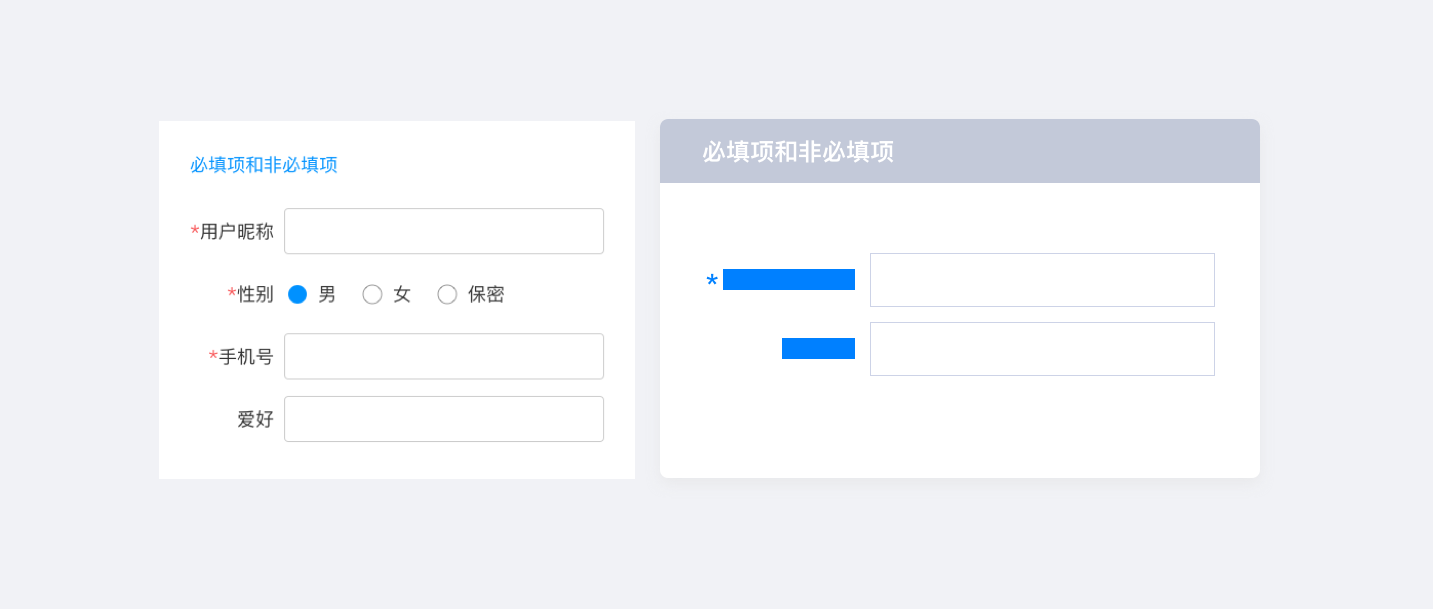 3.必填項(xiàng)指用戶(hù)必須要輸入的文本信息, 一般會(huì)用明確顏色凸顯, 非必填項(xiàng)一般是讓用戶(hù)選擇是否需要填寫(xiě)。