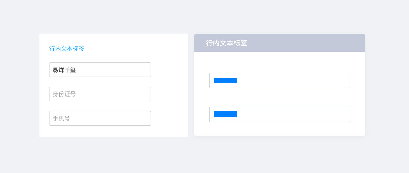 即標(biāo)簽位于輸入框內(nèi),擁有節(jié)約縱向和橫向空間的優(yōu)勢(shì)。行內(nèi)標(biāo)簽可分為齊行內(nèi)文本標(biāo)簽,行內(nèi)圖標(biāo)標(biāo)簽,浮動(dòng)標(biāo)簽