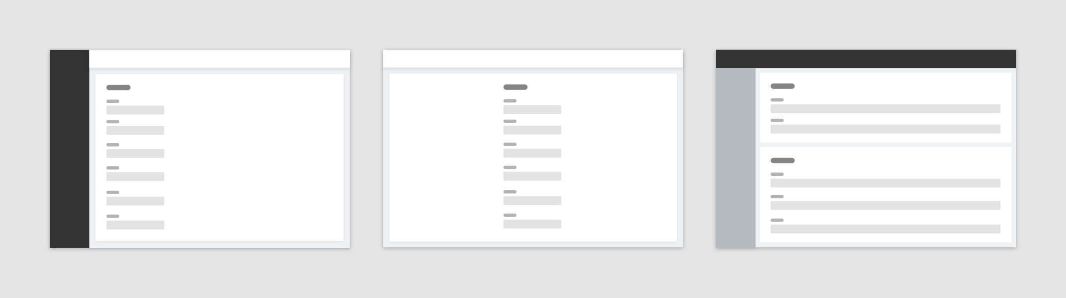 卡片分組布局一般用來處理高復雜類型表單。當業(yè)務中希望頁面承載眾多表單字段時,可將信息相關性弱的字段拆分為多個部分,并通過多個卡片分組承載不同類型字段,每個卡片都需有個卡片類別標題。