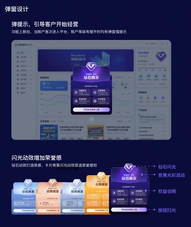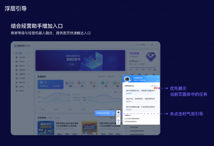 浮層:將操作入口前置披露,提升商家感知同時(shí)還可以縮短操作步長(zhǎng)。在商家等級(jí)項(xiàng)目里,衡量商家主動(dòng)經(jīng)營(yíng)的標(biāo)準(zhǔn)是做任務(wù),所以任務(wù)入口的前置披露是提升主動(dòng)經(jīng)營(yíng)的關(guān)鍵舉措。于是,圍繞商家等級(jí)包裝了“經(jīng)營(yíng)助手”的概念,幫助平臺(tái)給商家推薦一些成長(zhǎng)任務(wù)和優(yōu)化建議,并在平臺(tái)首頁主動(dòng)彈出,以此提高任務(wù)觸達(dá)率。但使用這種主動(dòng)觸達(dá)手段時(shí),需要考慮對(duì)商家的打擾和阻斷情況,所以需要對(duì)主動(dòng)彈出的頻率作限制,然后配合氣泡和標(biāo)簽等視效元素吸引商家視線。這樣可以引導(dǎo)商家參與商家等級(jí)完成任務(wù),促進(jìn)其成長(zhǎng)和等級(jí)提升。