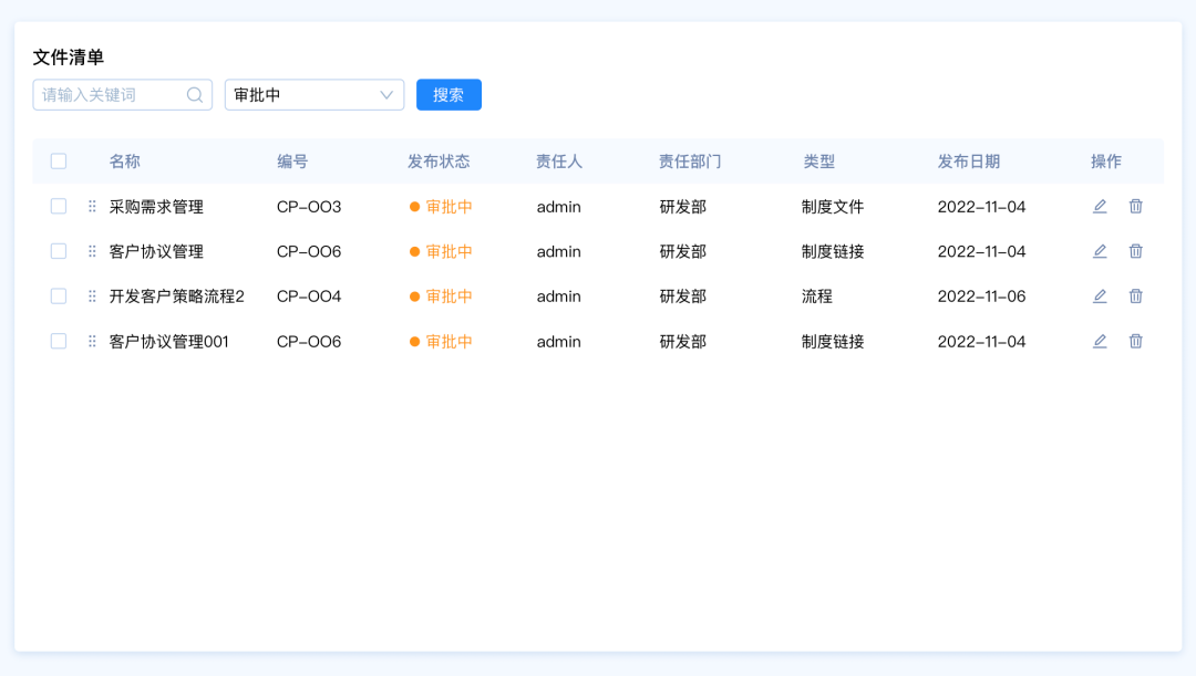 需求背景:客戶A想要快速篩選文件清單中發(fā)布狀態(tài)為“審批中”的數(shù)據(jù),能夠快速統(tǒng)計(jì)審批中的數(shù)據(jù)量,并且完成后續(xù)任務(wù)操作。
