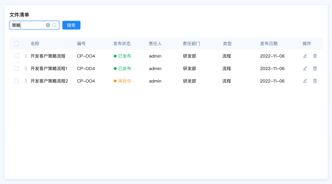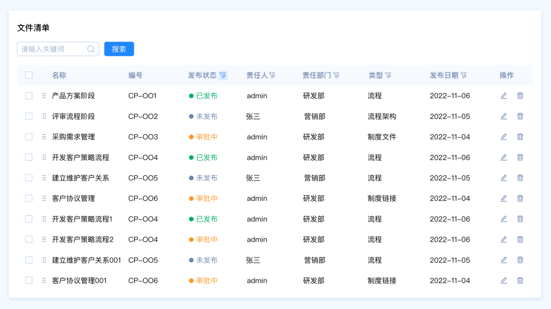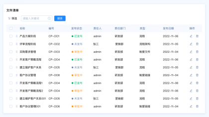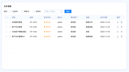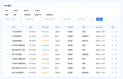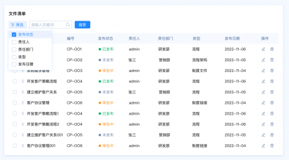 設(shè)計(jì)要點(diǎn):由于這里包含多種篩選類型,名稱和編號是關(guān)鍵詞篩選,發(fā)布狀態(tài)和、責(zé)任人、責(zé)任部門、類型是選項(xiàng)篩選,發(fā)布日期是時(shí)間區(qū)間篩選。所以我們需要采用組合篩選的模式。