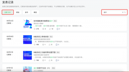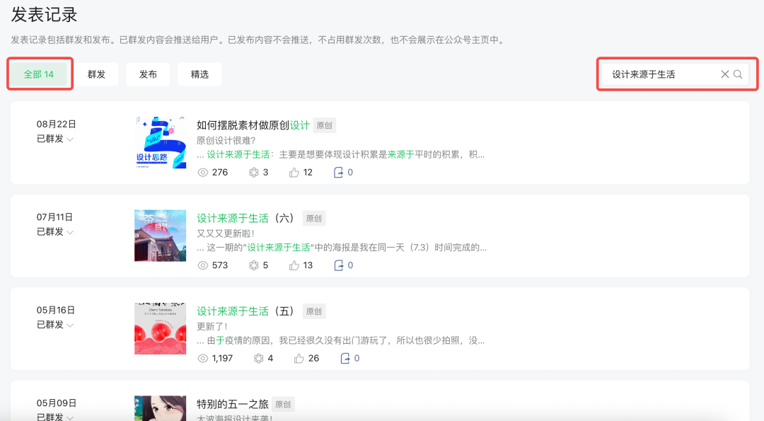 例如在微信公眾號發(fā)表記錄中的搜索,當(dāng)只輸入“設(shè)計(jì)”關(guān)鍵詞時(shí),搜索結(jié)果一共有202條,需要在這202條數(shù)據(jù)中找到自己的目標(biāo)值是比較難的。