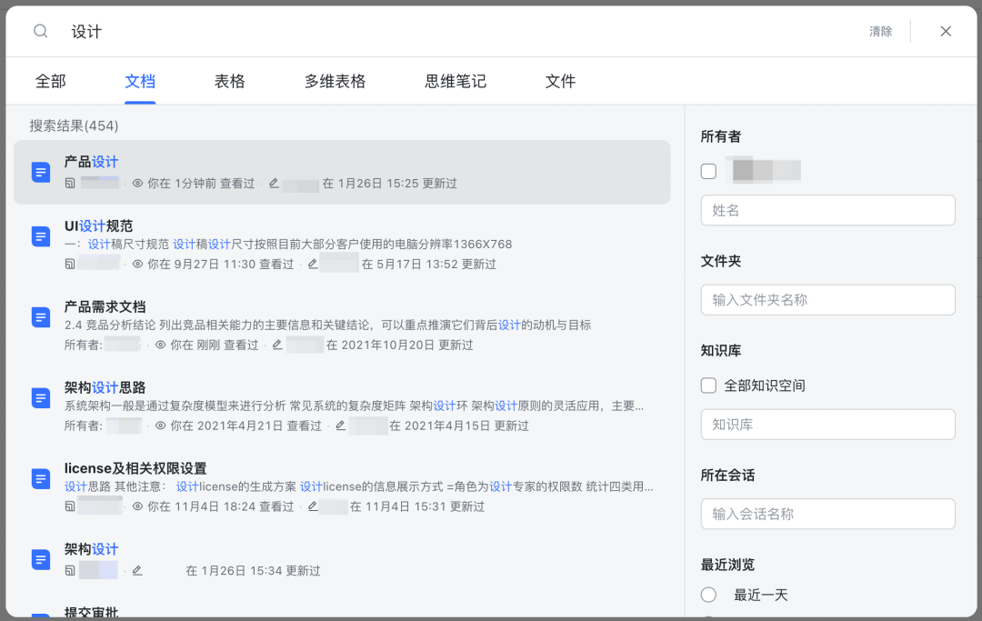 例如:在飛書文檔中,通過搜索關(guān)鍵詞后,分別展示該關(guān)鍵詞在文檔、表格、多維表格、思維筆記、文件五大類別中展示結(jié)果集,用戶通過類別區(qū)分,再縮小范圍尋找目標(biāo)值。