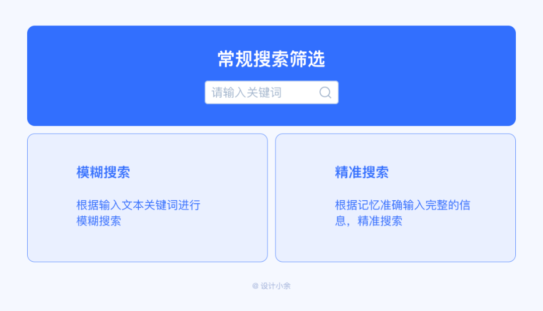 常規(guī)的搜索篩選不難理解,即常見的搜索框,根據(jù)輸入文本關(guān)鍵詞進(jìn)行模糊搜索或者根據(jù)記憶準(zhǔn)確輸入完整的信息,精準(zhǔn)搜索。文本關(guān)鍵詞搜索需要通過用戶的記憶來完成,只有當(dāng)用戶對需要搜索的內(nèi)容(關(guān)鍵詞)有記憶才能完成搜索篩選,搜索的結(jié)果范圍根據(jù)關(guān)鍵詞的精準(zhǔn)度而定。