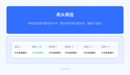 將篩選選項(xiàng)內(nèi)置在表頭中(更好地利用頁面空間,隱蔽不直觀)。當(dāng)頁面空間有限時(shí),可以考慮此方案。另外當(dāng)表格表頭字段數(shù)據(jù)較多時(shí),需要橫向滑動查看數(shù)據(jù)時(shí),建議還是直接將篩選條件單獨(dú)放在外面?;蛘弋?dāng)需要篩選的選項(xiàng)太多時(shí),表頭字段都能篩選時(shí),也可以考慮放在表頭中。