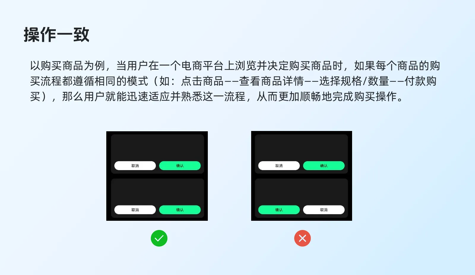 :確保用戶在執(zhí)行相似任務(wù)時(shí),如購買商品、搜索信息或提交表單等,能夠遵循相同的操作流程。這有助于用戶快速適應(yīng)并高效完成任務(wù)。