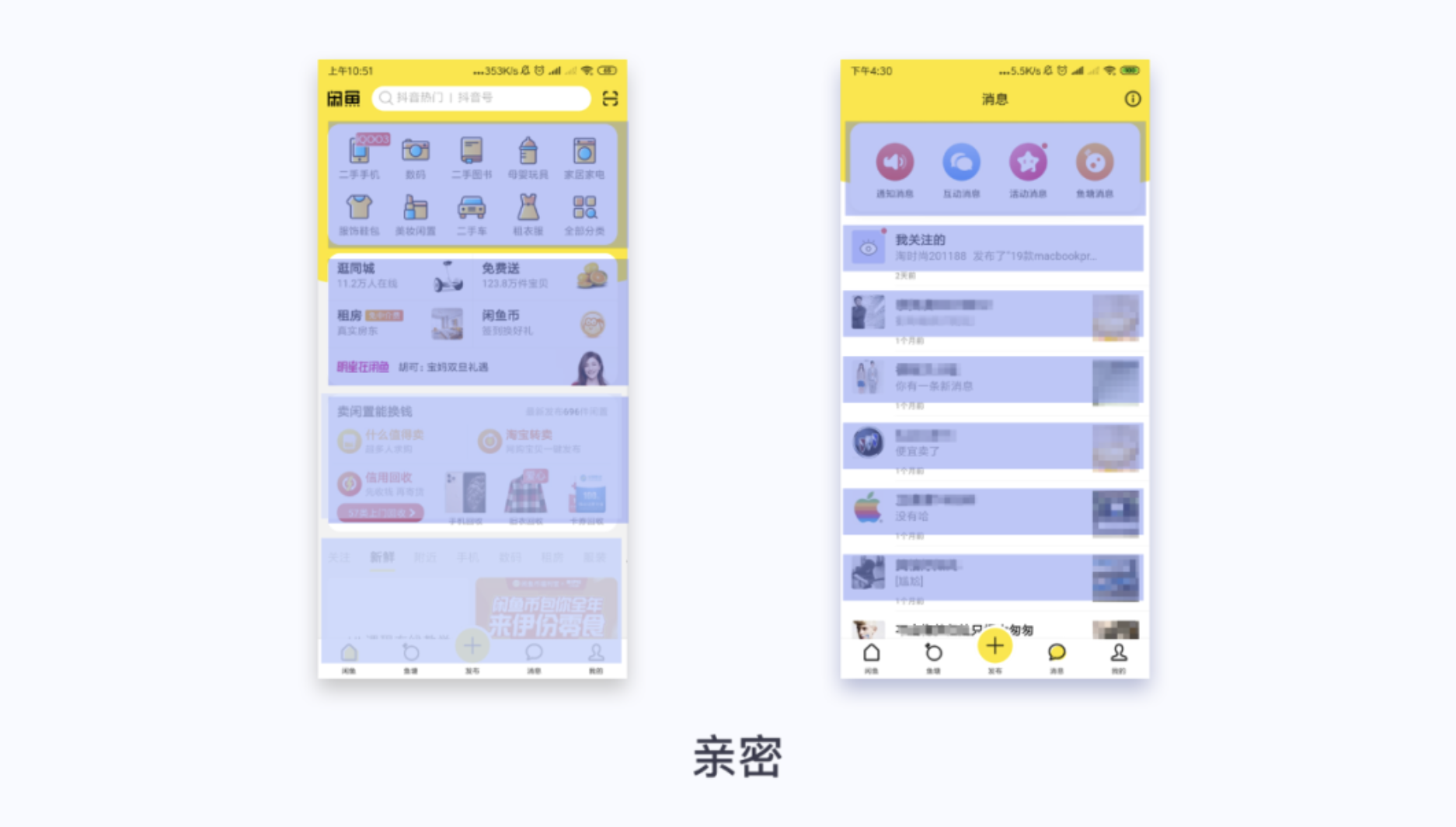 閑魚消息頁面頂部功能區(qū)域采用居中對齊方式,比較正式一些,突出顯示引導(dǎo)用戶點擊;個人頭像和消息左對齊顯示,發(fā)布圖片右對齊顯示。