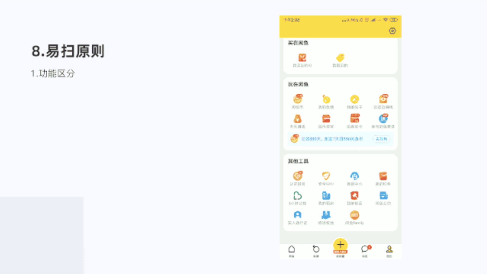 閑魚的我的頁面,每個區(qū)塊進(jìn)行功能區(qū)分,分為買、賣、玩、其他4個主要部分。降調(diào)層級,同時在區(qū)塊內(nèi)每個功能圖標(biāo)宮格顯示,也易于用戶查找,滿足了易掃原則,提示了用戶體驗。