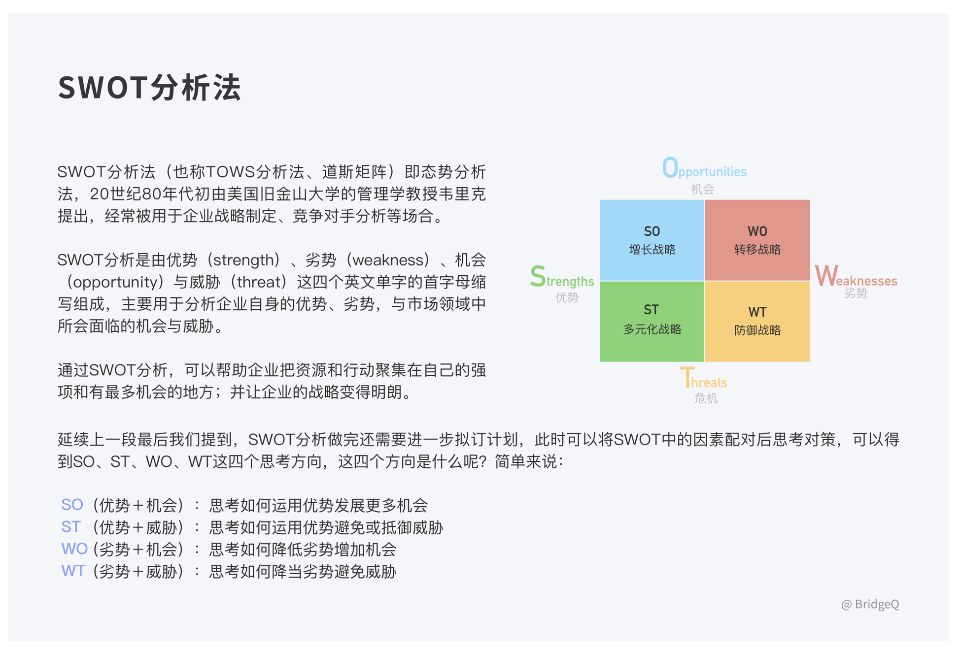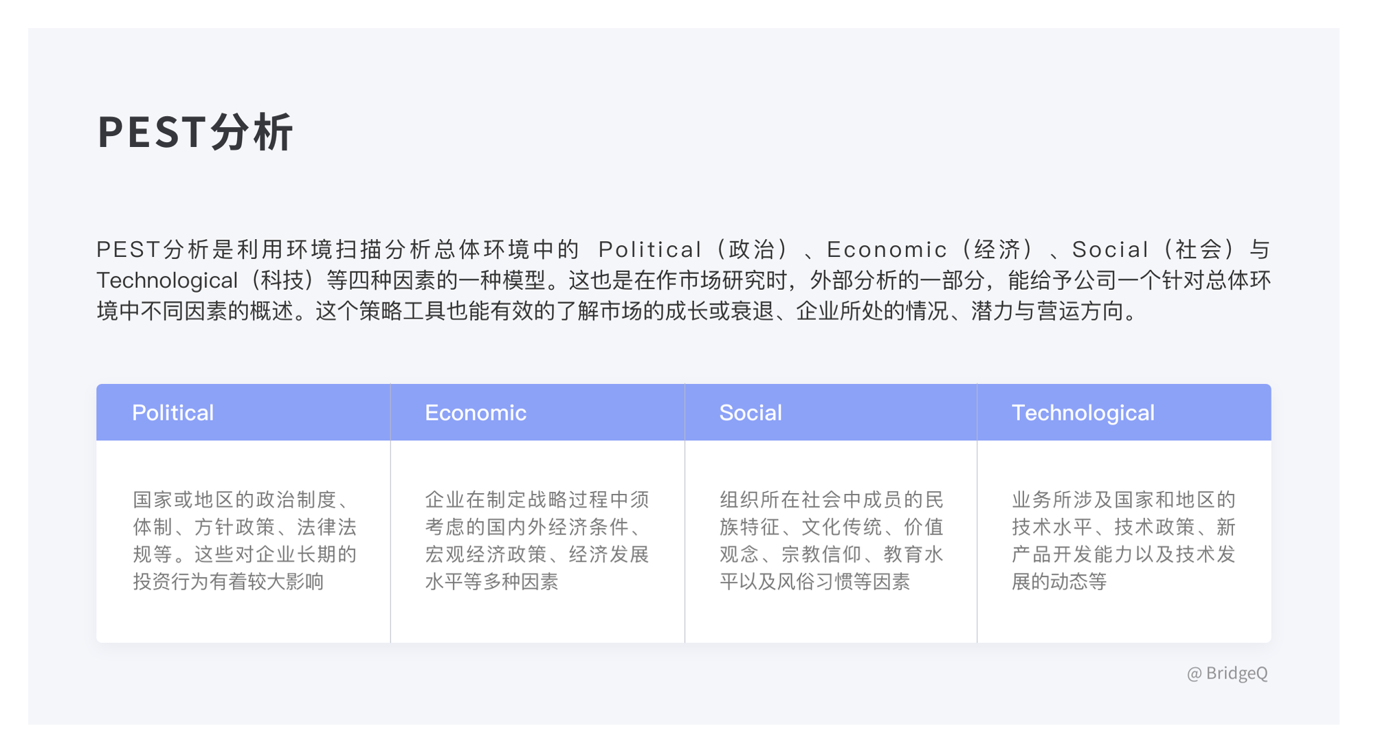 • 方法:PEST(宏觀環(huán)境)、波特五力模型(競爭態(tài)勢)、SWOT 分析(優(yōu)劣勢)。