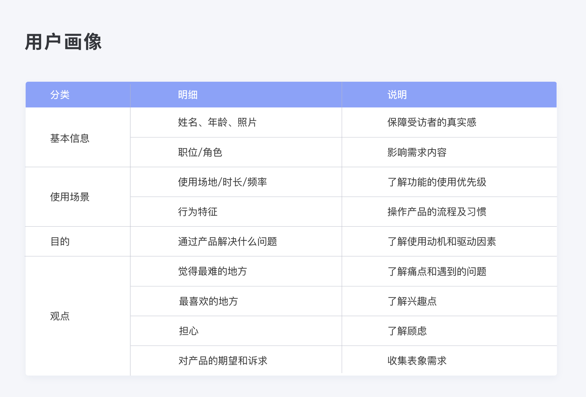 • C 端要素:基本信息、使用場景、痛點(diǎn)、期望;B 端要素:行業(yè)特征、公司規(guī)模、業(yè)務(wù)需求。