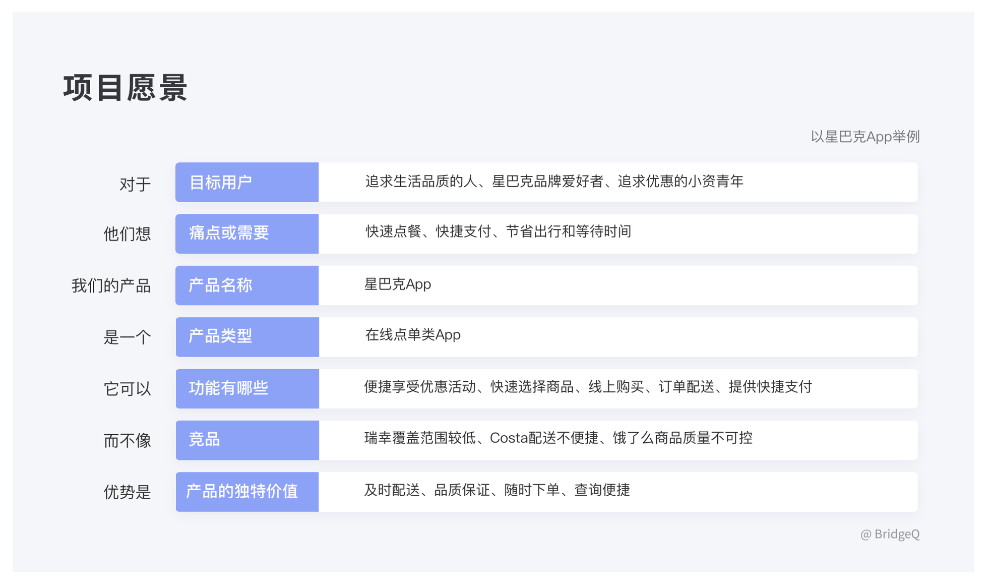 • 核心內(nèi)容:目標(biāo)用戶、痛點(diǎn)、產(chǎn)品定位、功能價(jià)值、競品差異、獨(dú)特優(yōu)勢,需簡潔且突出重點(diǎn)。