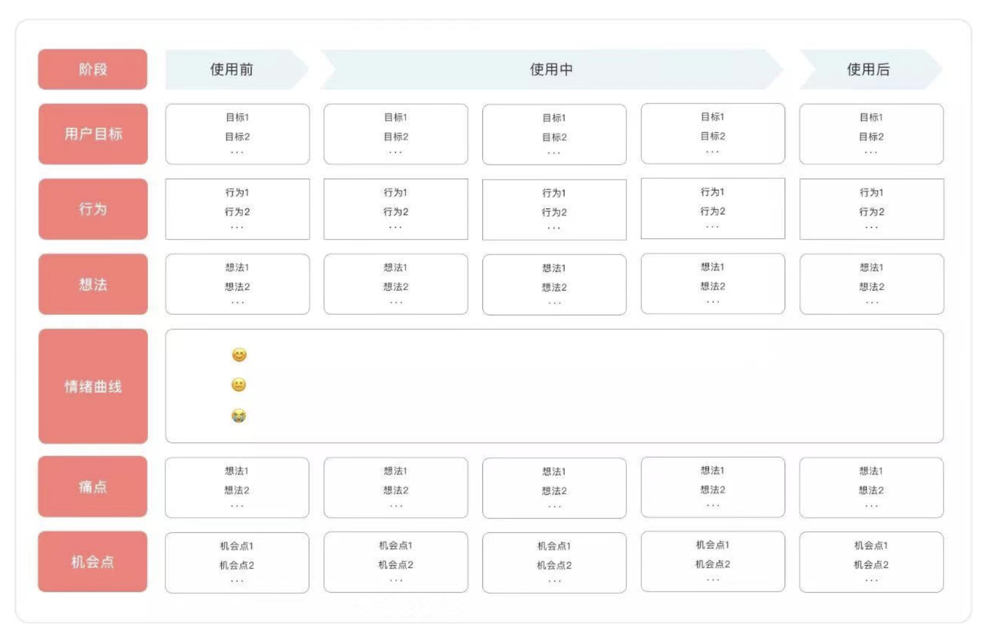 • 定義:可視化用戶全流程行為與情緒,還原 “使用前 - 中 - 后” 階段的目標(biāo)、觸點(diǎn)與痛點(diǎn)。