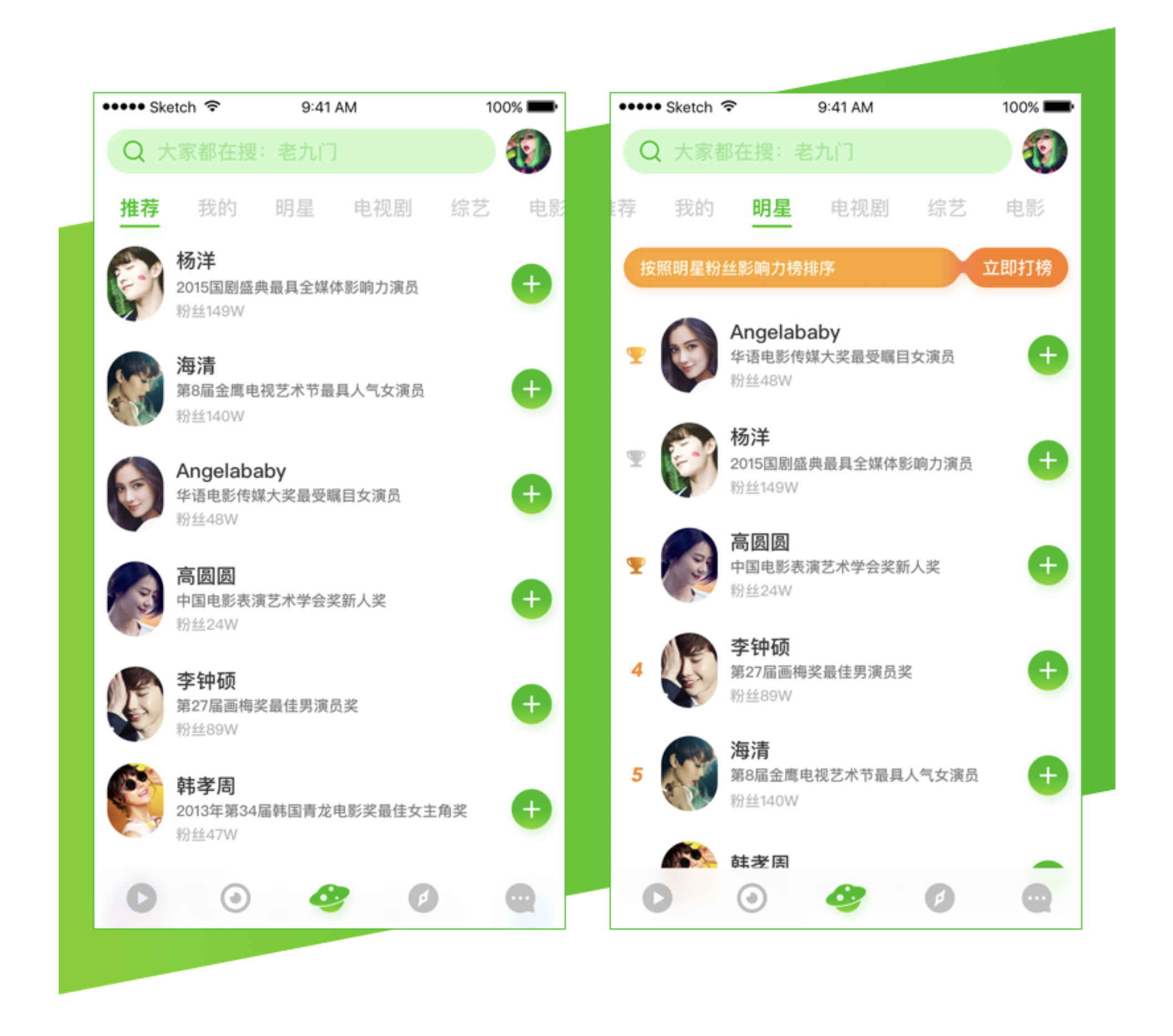 - 信息展示:明星圈簡介字段保留,布局與推薦頁一致;明星標簽頁將排序信息放列表左側(cè),不外露影響力分值等與排名相關(guān)信息,營造榜單氛圍。