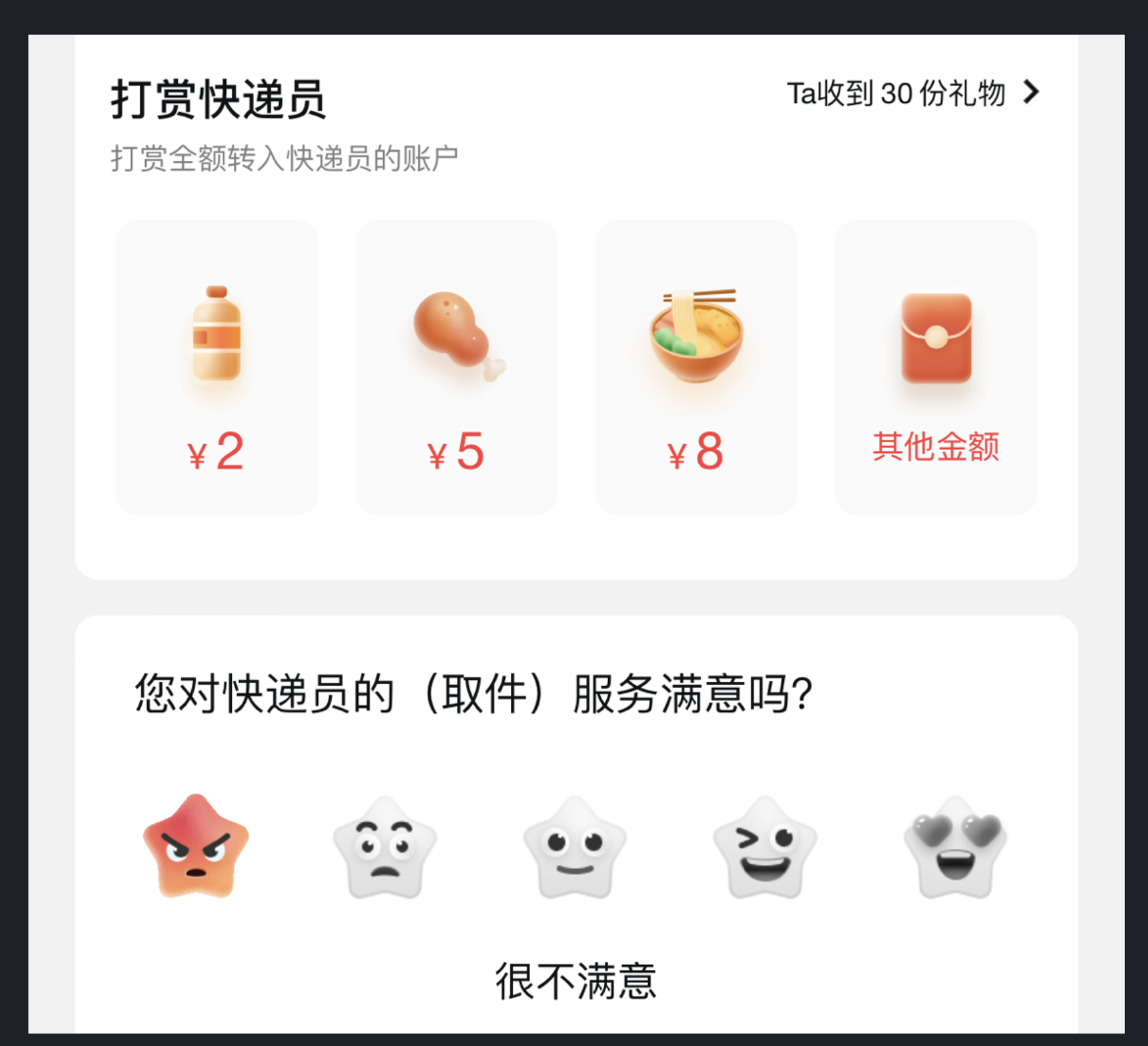 順豐速運在用戶完成快遞服務(wù)后,通過打賞功能和滿意度評價環(huán)節(jié),用直觀的表情圖標體現(xiàn)不同滿意度等級(很不滿意、不滿意、一般、滿意、非常滿意),并搭配具體評價選項,既形象傳遞信息,又提升了用戶參與度。