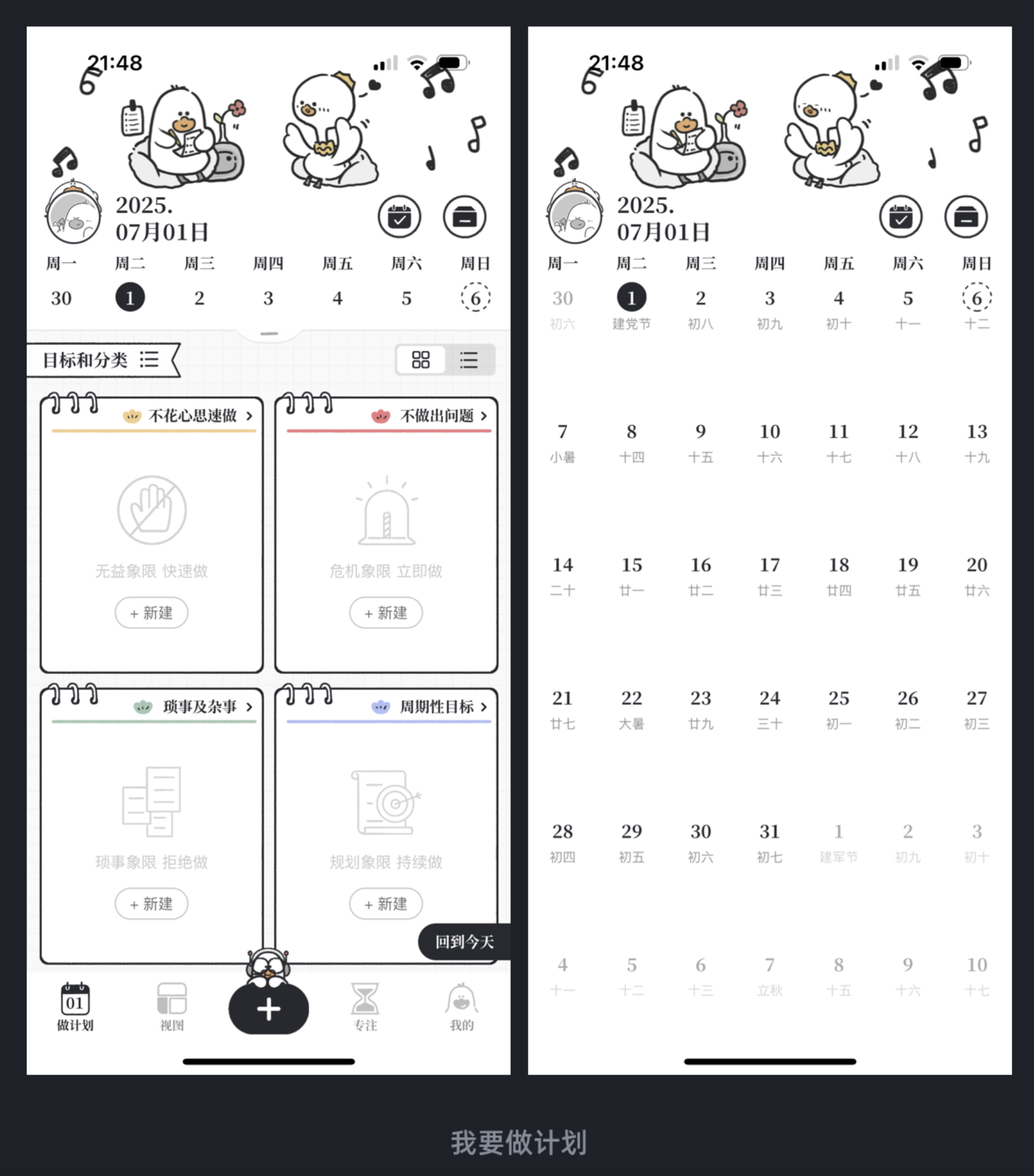 “我要做計劃” App 不僅日歷下拉展開 / 收起的交互便利,還在左右切換時模擬翻頁聲效,搭配涂鴉式設(shè)計風格,增強了場景代入感。image.png