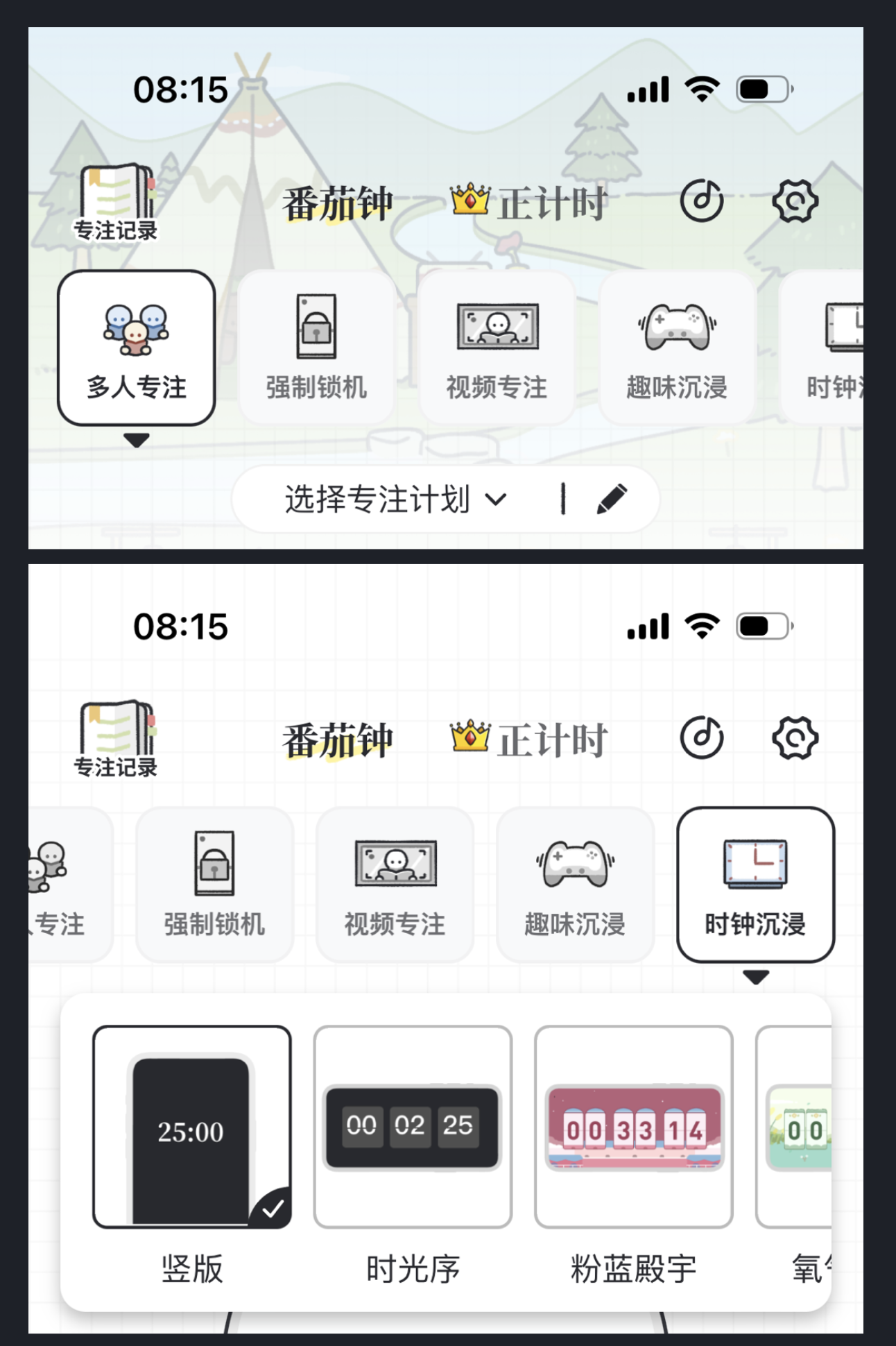 “我要做計劃” App 的 “專注” 欄目采用懸浮式主題篩選,用戶可選擇登山、海底探險等主題,直觀的樣式讓設(shè)置操作更清晰,提升了感官和體驗感。