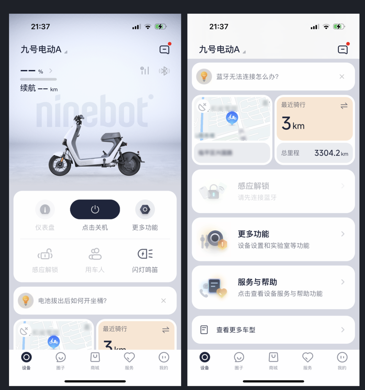 九號出行 App 體現(xiàn)了 Bento UI 設(shè)計趨勢,界面如便當盒般有清晰區(qū)塊劃分,功能區(qū)分明確,整體整齊美觀,富有層次感、現(xiàn)代感。