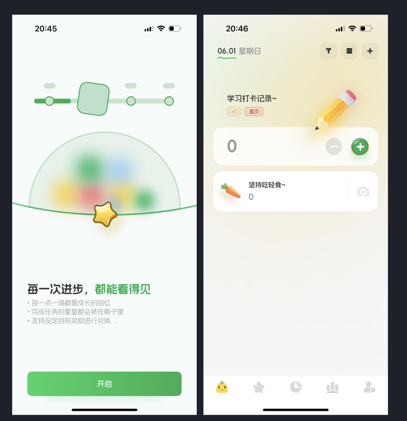 “星習慣” App 集習慣養(yǎng)成、學習打卡、生活記錄等功能于一體,其 UI 設(shè)計區(qū)別于大眾化風格,符合年輕用戶審美,交互邏輯也值得學習,用戶可通過完成任務(wù)收集 “星星”,還能設(shè)置目標獎勵等。