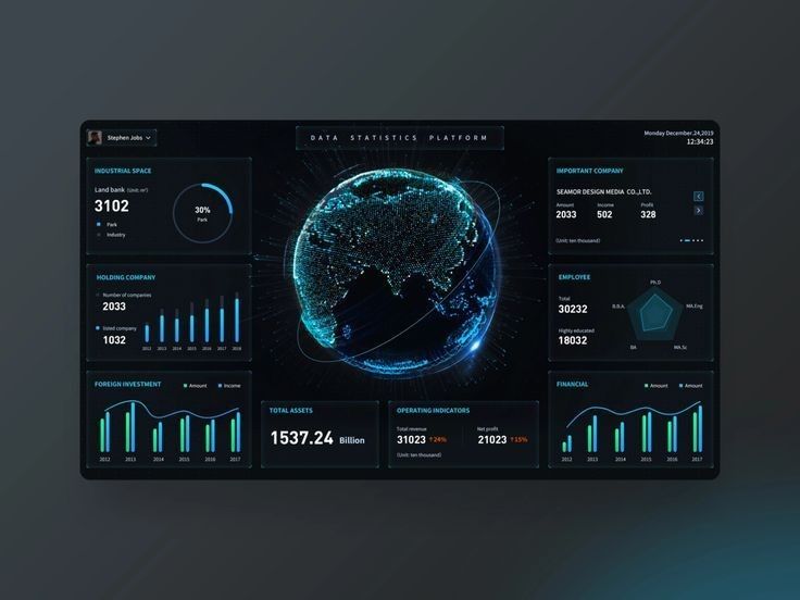 企業(yè)數(shù)據(jù)往往枯燥且復(fù)雜,而這類設(shè)計(jì)卻讓數(shù)據(jù) “活” 了起來。深色背景與熒光色、科技藍(lán)的碰撞,既拉滿科技氛圍,又通過色彩區(qū)分?jǐn)?shù)據(jù)維度,讓層級(jí)一目了然。環(huán)形圖、折線圖等可視化組件,把營(yíng)收、用戶增長(zhǎng)等數(shù)據(jù)動(dòng)態(tài)展示,仿佛數(shù)據(jù)在 “講述” 企業(yè)故事。這讓我們思考:數(shù)據(jù)類 UI 不該只是 “數(shù)據(jù)的容器”,更應(yīng)是 “數(shù)據(jù)的翻譯官”,蘭亭妙微在做類似設(shè)計(jì)時(shí),也會(huì)努力讓專業(yè)數(shù)據(jù)變得更易感知、更能輔助決策。
