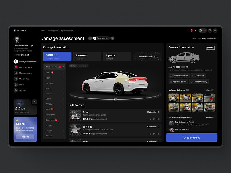 汽車定損專業(yè)性強(qiáng),UI 既要體現(xiàn)嚴(yán)謹(jǐn),又要降低用戶理解門檻。設(shè)計(jì)中,汽車 3D 模型可交互查看,受損部位色彩標(biāo)注清晰,定損金額、維修時(shí)長(zhǎng)等信息一目了然。深色界面搭配藍(lán)色操作按鈕,既符合專業(yè)場(chǎng)景調(diào)性,又通過色彩引導(dǎo)操作流程。這給我們的啟發(fā)是:專業(yè)場(chǎng)景的 UI,不是要 “拒人千里”,而是要通過設(shè)計(jì),把專業(yè)內(nèi)容 “友好地” 呈現(xiàn)給用戶,蘭亭妙微在這類項(xiàng)目中,也會(huì)深入調(diào)研業(yè)務(wù)流程,讓設(shè)計(jì)為 “專業(yè)” 賦能,而非添堵。
