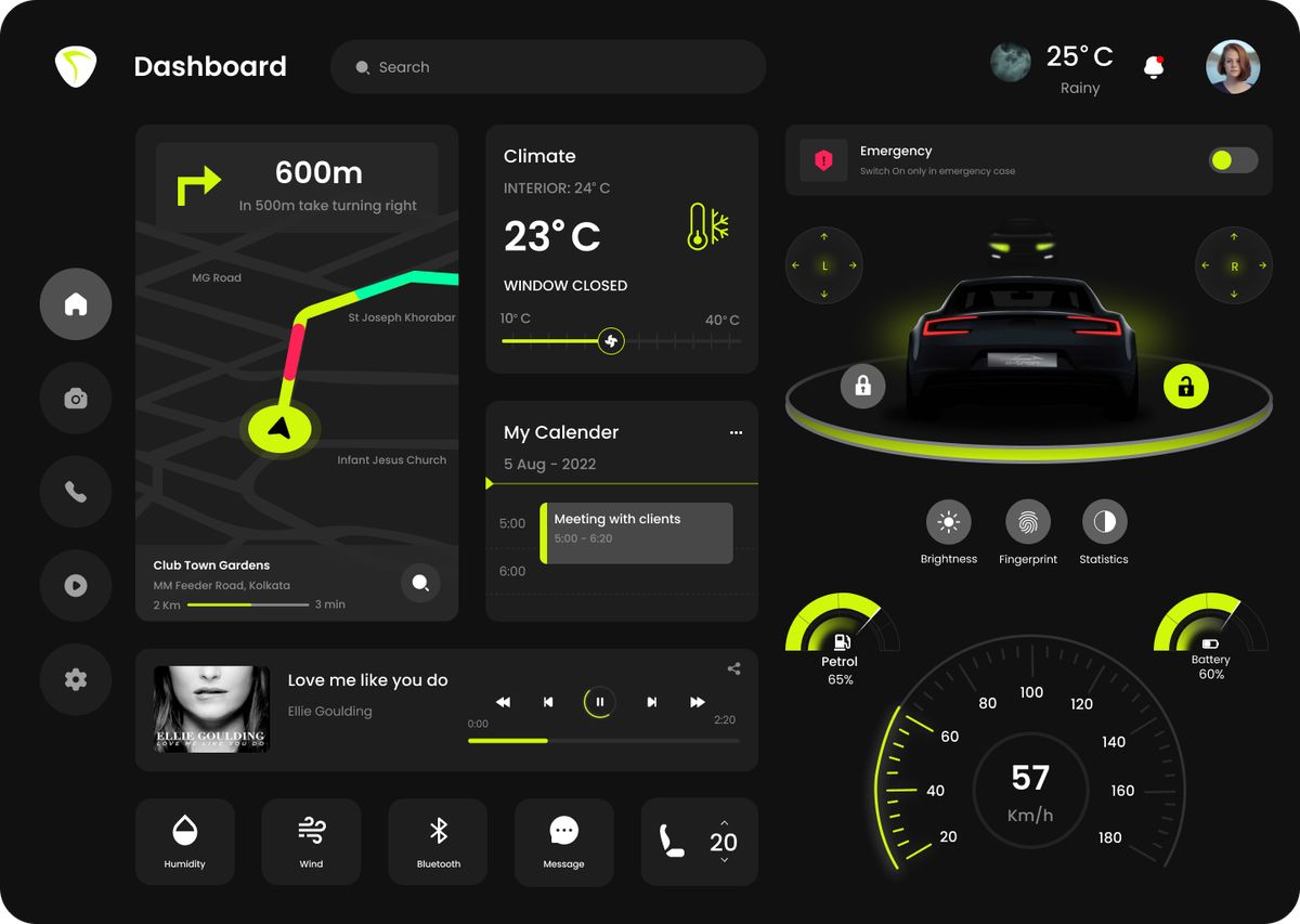 汽車中控是用戶出行的高頻交互場(chǎng)景,設(shè)計(jì)不僅要 “能用”,更要 “好用且愉悅”。這類界面將導(dǎo)航、車況、娛樂等功能整合,深色主題搭配熒光黃交互元素,既避免強(qiáng)光干擾駕駛,又讓操作區(qū)清晰可辨。實(shí)時(shí)路況、車輛能耗的直觀展示,音樂播放的便捷控制,都圍繞 “駕駛場(chǎng)景下的高效交互” 展開。這和我們的設(shè)計(jì)理念不謀而合 —— 科技產(chǎn)品的 UI,應(yīng)模糊 “工具” 與 “伙伴” 的邊界,讓每一次使用都成為舒適的體驗(yàn)。