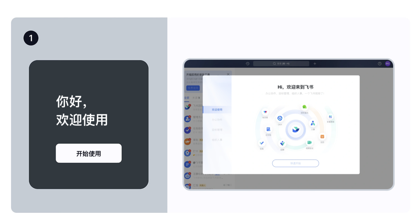 • 例子:飛書的歡迎頁會直接告訴用戶 “這里有辦公協(xié)作、云文檔、審批等功能”,既點明核心價值,又定下專業(yè)的辦公氛圍;