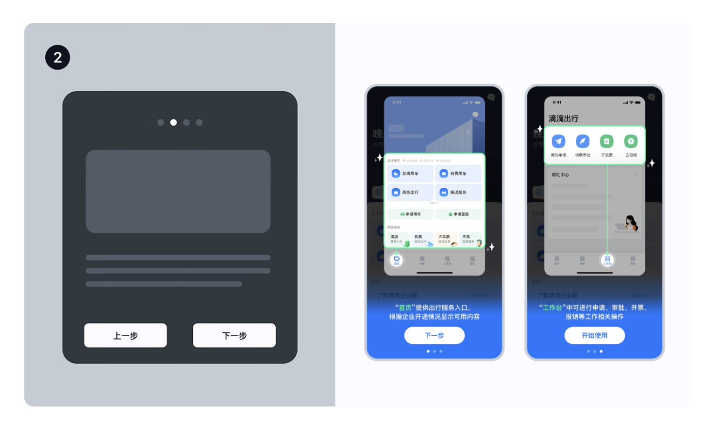 • 例子:滴滴企業(yè)版的新手引導,先講 “首頁有出行服務入口”,再講 “工作臺能審批、開票”,每步只傳遞一個信息,用戶不會覺得混亂;
