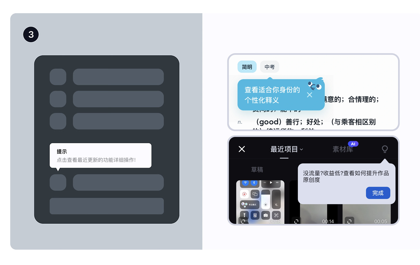 • 例子:視頻剪輯 APP 不用一上來就教 “怎么加轉(zhuǎn)場、調(diào)色”,先讓用戶學會 “導入視頻、剪片段”,等用戶想讓視頻更好看時,再在 “轉(zhuǎn)場” 按鈕旁加提示;