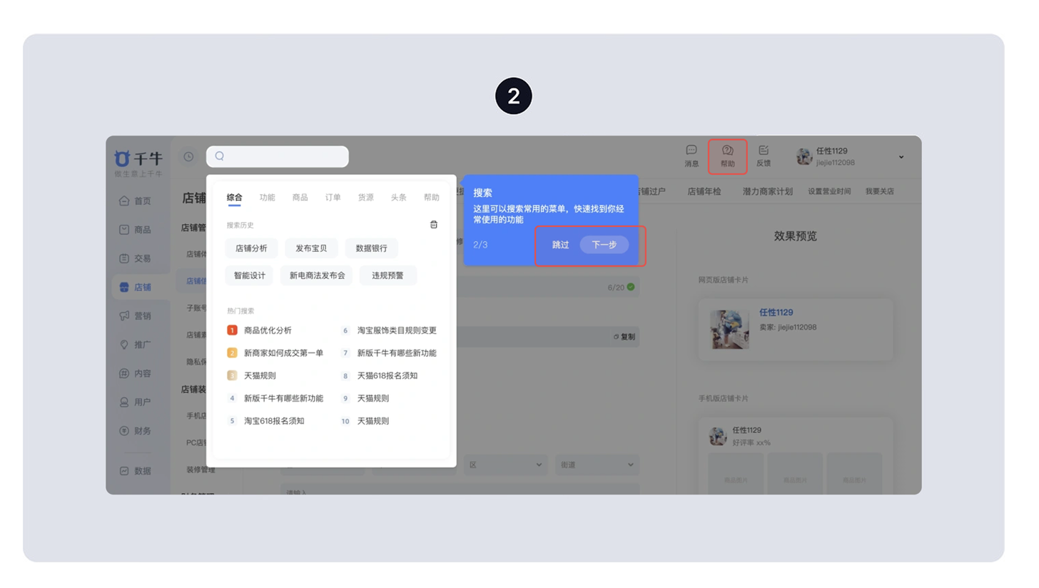 • 例子:千牛 APP 的新手引導會提示 “這里能搜索常用功能”,用戶可以點 “下一步” 繼續(xù)看,也能直接點 “跳過”;Notion 沒有強制引導,而是單獨做了 “幫助頁面”,用戶有問題再去查;