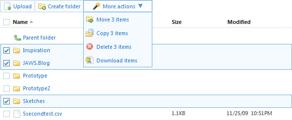 這種方式可以很好地讓用戶批量完成多行的操作。選中每一行前面的復(fù)選框,點(diǎn)擊批量操作鏈接或按鈕,用戶可以選中多行進(jìn)行操作。還是以DropBox為例,用戶可以選中多條文件,點(diǎn)擊菜單進(jìn)行批量操作。
