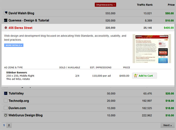 關(guān)于這種模式我寫(xiě)過(guò)一篇文章,也建了一個(gè)可以輕松實(shí)現(xiàn)的jQuery小插件。 這種模式的關(guān)鍵點(diǎn)就是可以給表格增加更多相關(guān)信息功能。以BuySellAds為例,展開(kāi)行顯示了出版商的廣告詳細(xì)信息,同時(shí)始終顯示主行里的重要信息。