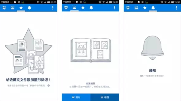 Dropbox是筆者非常喜歡的一款網(wǎng)絡(luò)文件同步工具,產(chǎn)品面臨的問(wèn)題是需要引導(dǎo)用戶上傳內(nèi)容。應(yīng)用在用戶首次使用收藏、相冊(cè)及提醒功能時(shí)通過(guò)灰階加線條風(fēng)格的圖示和淺白的文字說(shuō)明告知用戶如何使用這三個(gè)功能,畫(huà)面在保持一貫品牌風(fēng)格的同時(shí)也降低了用戶因?yàn)榱斜韮?nèi)空無(wú)一物而產(chǎn)生情緒上的挫敗感。