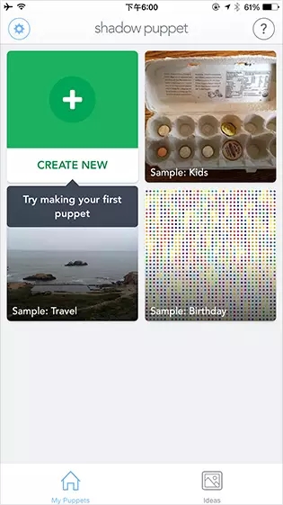 Shadow Puppet可以把照片和視頻剪輯結(jié)合聲音、貼紙等制作成動(dòng)畫(huà),制作簡(jiǎn)單,被譽(yù)為視頻版的PPT。它的首頁(yè)預(yù)置了展示用的視頻樣本,用戶可以通過(guò)觀看視頻案例對(duì)Shadow Puppet的視頻制作有感性的認(rèn)知。