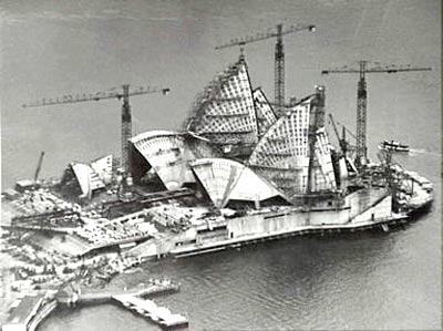 屋頂設(shè)計,但關(guān)鍵在于木頭模型好做,巨大的水泥真家伙建造難度實在是太大了,設(shè)計在后來的建造過程中被反復修改。 第一個大麻煩是烏特松拒絕了多支柱承重頂板和輕鋼結(jié)構(gòu)的建議,而堅持使用水泥澆筑的工藝,結(jié)構(gòu)設(shè)計就此停滯,甚至結(jié)構(gòu)工程師艾拉普(Ove Arup)決定不接這玩命的活了。此時烏特松的才華又一次得到展現(xiàn),當他一籌莫展地坐在廚房里看著妻子切橘子的時候,他突然發(fā)現(xiàn)彎曲的橘子皮一個一個都站在案板上。他抱著橘子皮跑到艾拉普(Ove Arup)面前興奮不已,所有的結(jié)構(gòu)工程師頓開茅塞,此后水泥預制件開始在建筑業(yè)興起。1958年3月,烏松和艾拉普(Ove Arup)第二次次拜訪了悉尼的時候,他們聯(lián)合發(fā)表了名為紅皮書的悉尼歌劇院初步設(shè)計方案。 高興了沒幾天第二個大麻煩接踵而來,既然是構(gòu)建預制建筑,那么各構(gòu)件的標準化精度就是一個難以攻克的問題,要知道當時的計算機還沒在建筑領(lǐng)域廣泛使用,尤 其是建筑如此巨大的球形屋頂,多次拼合,機構(gòu)工程師無法準確計算出每一塊屋頂?shù)幕《扰c分割,這樣就不能天衣無縫地組合在一起。從1957年到1963年