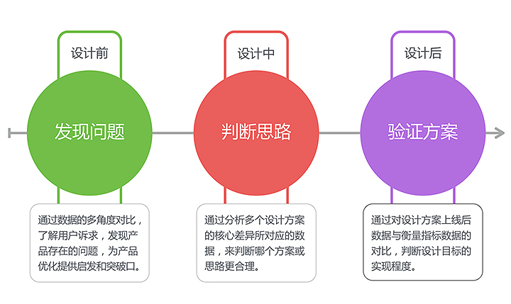 (3)設計后用于驗證設計 通過計算上線后的產(chǎn)品數(shù)據(jù),對比設計前設定的指標數(shù)據(jù),判斷設計目標的實現(xiàn)程度。