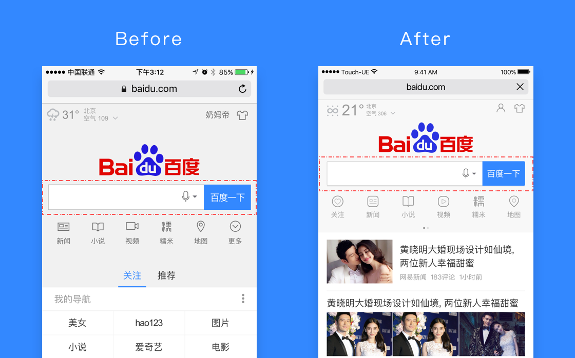 讓搜索干干凈凈,清晰的視覺風(fēng)格,去掉搜索框的效果修飾, 背景顏色更加清爽。 這是我們百度首頁UE團(tuán)隊的工作理念和設(shè)計觀,這是我們團(tuán)隊元思考和組織建設(shè)的基礎(chǔ)。經(jīng)過不斷的磨煉與反思,我們充分認(rèn)識到了工作理念和設(shè)計觀對于一個團(tuán)隊的重要性,我們時刻在提醒自己,要不斷對已有的經(jīng)驗(yàn)和結(jié)論進(jìn)行反思,要從更多的視角對它進(jìn)行觀察和思考。只有與時俱進(jìn),才能生生不息。
