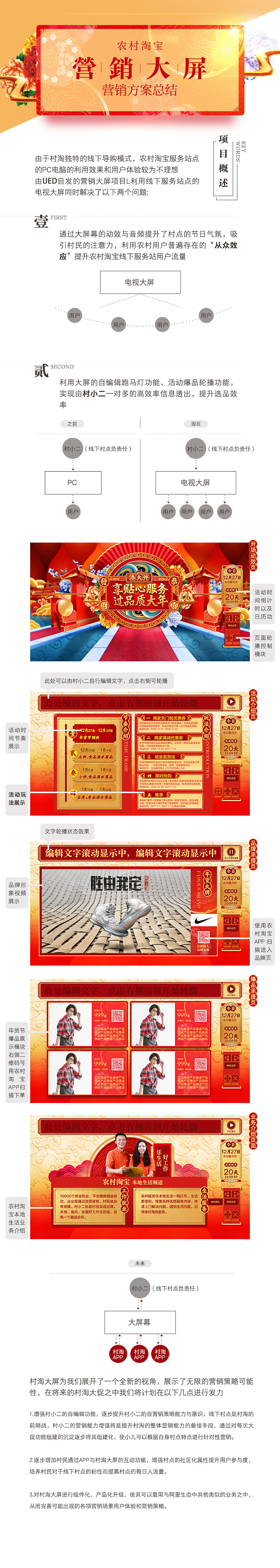 元旦已立,新春即臨,這是中國人最重要的傳統(tǒng)節(jié)日,也代表了農(nóng)村淘寶年度最為重要大型促銷活動年貨節(jié)的即將上線。我們在本次大促之中除了完成常規(guī)的需求之外也進(jìn)行了多項創(chuàng)新性嘗試與自發(fā)的創(chuàng)新項目,包括針對線下營銷場景特點的視頻制作,創(chuàng)新大屏的全新功能上線等等。