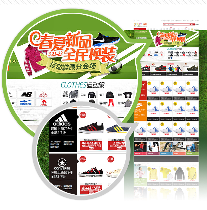 拍拍3月的大型促銷活動(dòng)《春夏新品,全民換裝》,主會(huì)場設(shè)計(jì)上運(yùn)用明快、鮮艷的春夏色彩塊組合,在細(xì)節(jié)上采用花朵草地藍(lán)天更加突顯初春購物的輕松氛圍。并在活動(dòng)頭部主畫面中采用HTML5+CSS3實(shí)現(xiàn)的酷炫動(dòng)畫,為用戶帶來了全新的頁面體驗(yàn)。