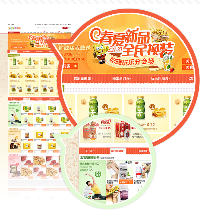 3月促食品分會(huì)場運(yùn)用鮮明的色彩,大背景采用不同食品線稿大小不一、層次分明的組合,渲染出美食熱鬧的氛圍,從而提高消費(fèi)者的購買欲望