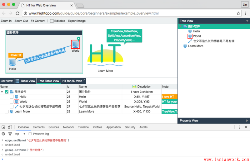 這個(gè)例子增加了設(shè)置父子關(guān)系的代碼,同時(shí)有更多的組件(拓?fù)鋱D、屬性頁、列表、樹、表格、樹表組件)綁定了同一個(gè)數(shù)據(jù)模型 DataModel,但用戶的代碼依然主要在 Data 和 DataModel 上的操作,這也是 HT 架構(gòu)設(shè)計(jì)的優(yōu)勢(shì),用戶使用更多組件并沒有增加新的學(xué)習(xí)成本,只要掌握的 DataModel 的基本操作,更多的組件也是如此。