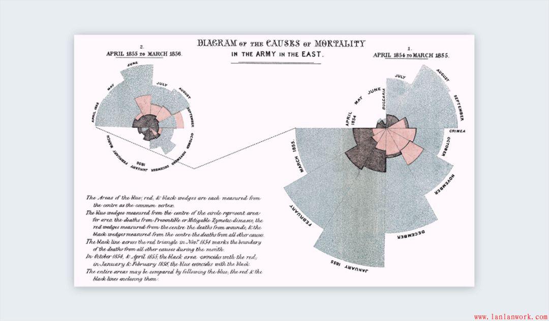 1857年,英國(guó)護(hù)士佛羅倫斯·南丁格爾使用信息圖形,說(shuō)服維多利亞女王改善軍隊(duì)醫(yī)院的條件。她的圖表顯示了克里米亞戰(zhàn)爭(zhēng)每個(gè)月的死亡人數(shù)和原因:可預(yù)防的藍(lán)色疾病,紅色傷口和其他黑色病因。