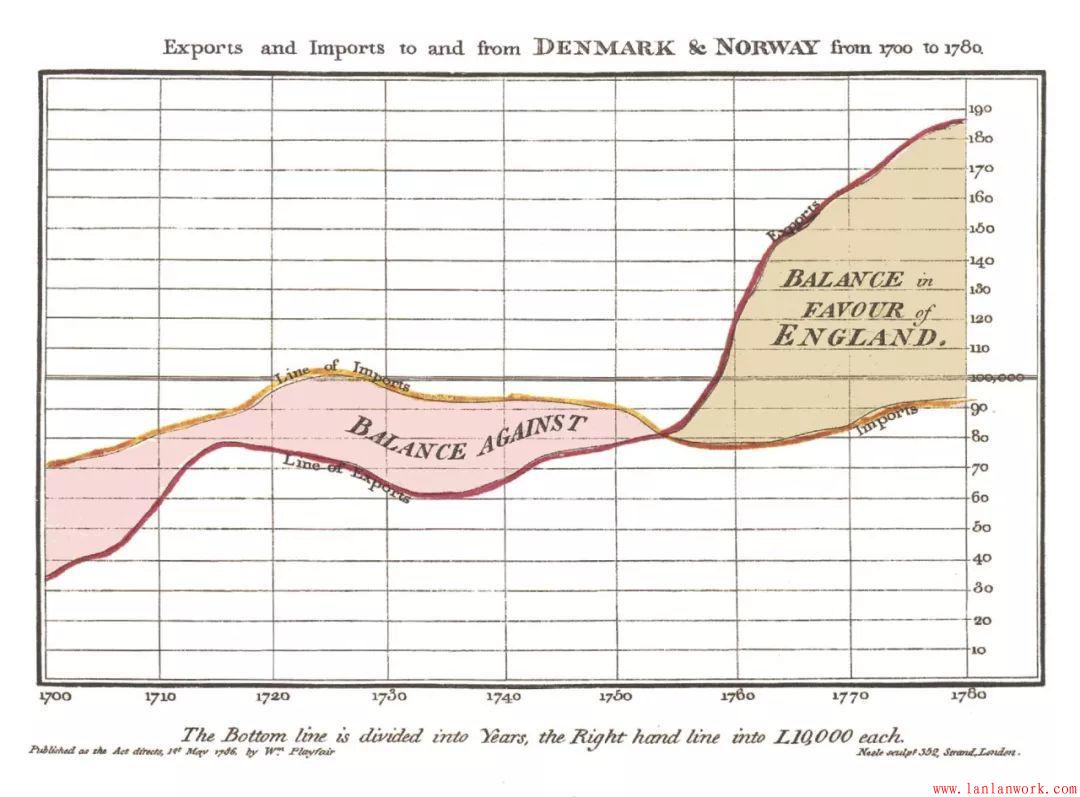 更為現(xiàn)代的信息圖表歷史可能始于William Playfair,他是統(tǒng)計(jì)圖形學(xué)的早期創(chuàng)新者。1786年,他出版了商業(yè)和政治地圖集,其中顯示了許多代表英格蘭經(jīng)濟(jì)的條形圖,折線圖和直方圖。他在1801年用第一張面積圖和第一張餅圖進(jìn)行了跟蹤。