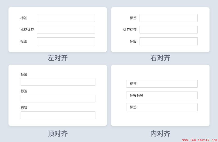 標(biāo)簽對齊方式有左對齊、右對齊、頂對齊、內(nèi)對齊,都有各自優(yōu)缺點,不同場景酌情使用。